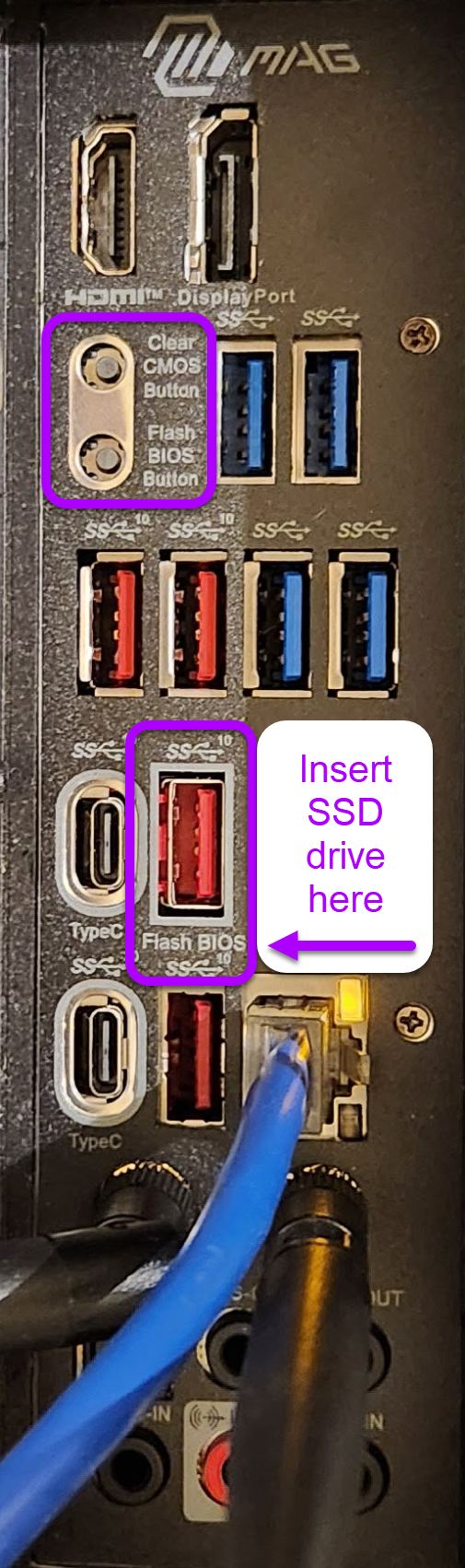 MSI.ROMto the root of the USB drive. - Insert the flash drive into the USB port on the motherboard back panel labeled Flash BIOS.